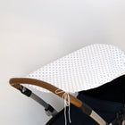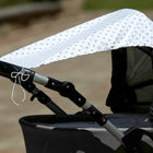 Perméable à l'air : la protection solaire à pois gris sur fond blanc est cousue très étroitement afin que très peu de lumière UV passe à travers, mais reste néanmoins perméable à l'air et protège votre bébé.